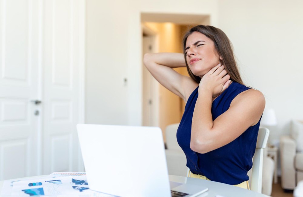 - Physical strain: Overusing your neck muscles during repetitive or strenuous activities can lead to stiffness and pain. Poor posture, weak abdominal muscles and heavier body weight can affect your spine’s alignment and contribute to neck pain. For example, straining your neck to view a computer screen for long periods is a common cause of neck pain.